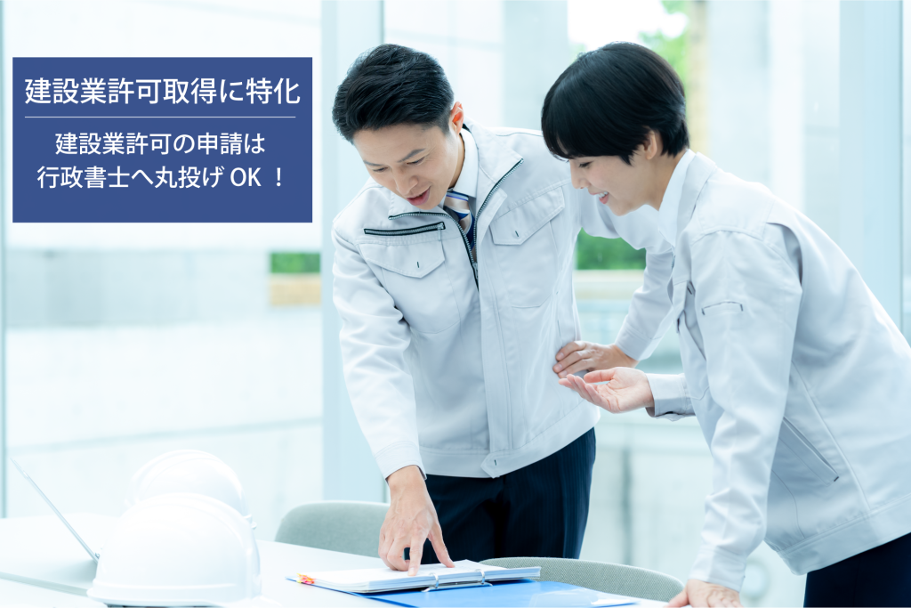 | 建設業許可に対応した 行政書士が対応 | 書類の取得から申請まで ワンストップサービス | 最短5日での申請 (営業日) |